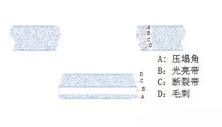 過(guò)大間隙形成帶有較大卷邊和邊緣撕裂的孔,令剖面稍微有一薄邊緣突出。太小的間隙形成帶稍微卷邊和大角度撕裂,導(dǎo)致剖面或多或少地垂直于材料表面。