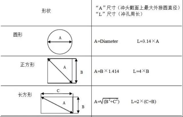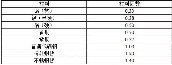 沖壓力(KN)=沖壓孔的周長(L)×材料厚度(T) ×0.345×材料因數(shù)(F) ×剪切因數(shù)(S) 計算單位為mm,材料因數(shù)(F)的選擇(見下表)